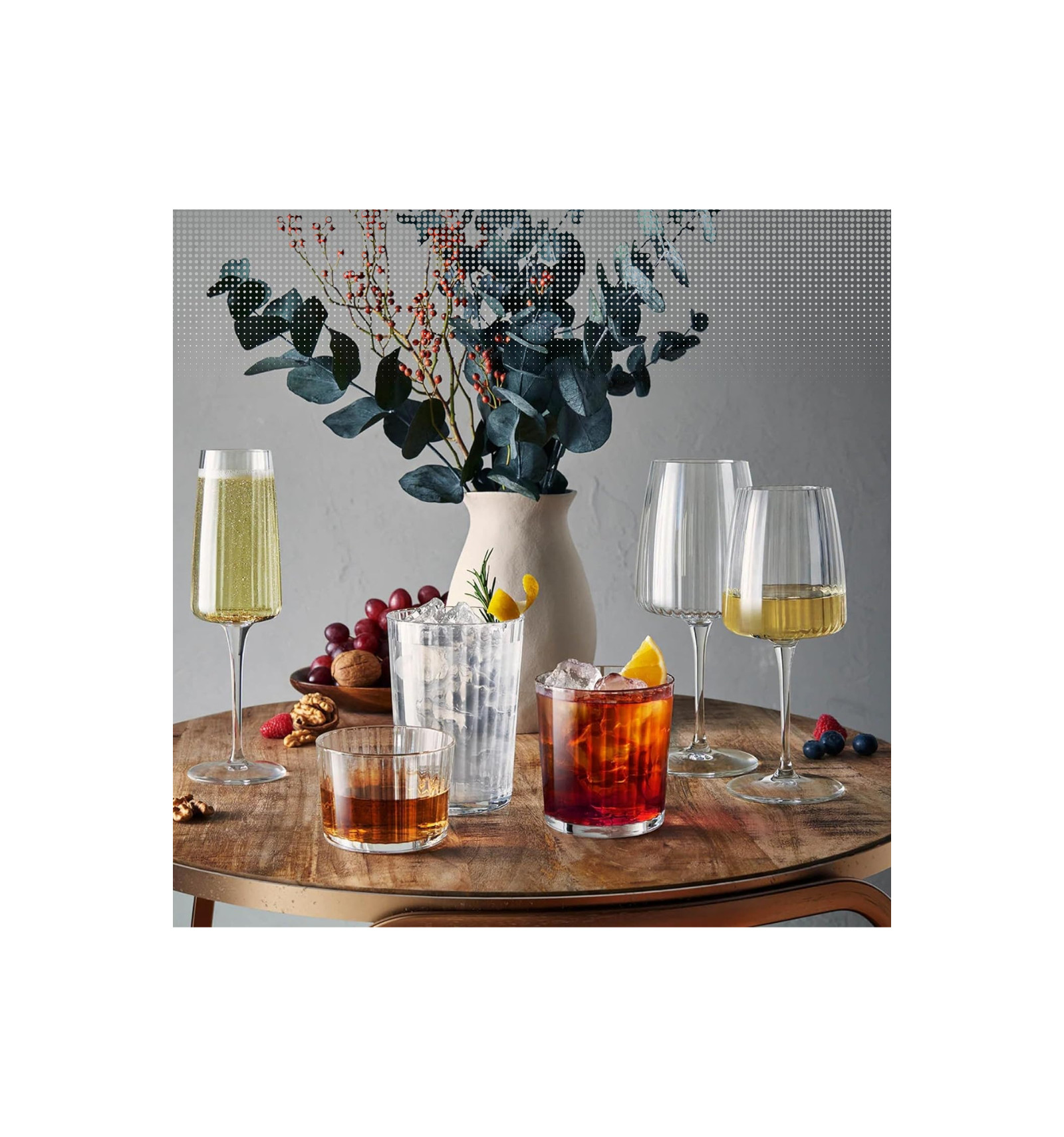 elegantu rievota glāze ūdenim, sulai, alum, kokteiļiem un ledus kafijai, ražots Itālijā,